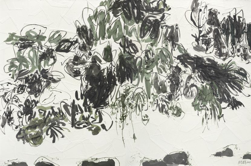 墨、炭筆、礦物顏料、棉紙拼貼於紙板